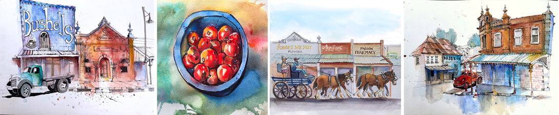 My art is rather eclectic. I love Travel Journalling incorporating text, stories, collage, recipes, food sketches and watercolour paintings in my journals whilst on tour and I love showing people how to make a sketchbook journal look fabulous and be a thing to keep and treasure always. See a small range of my art below.
